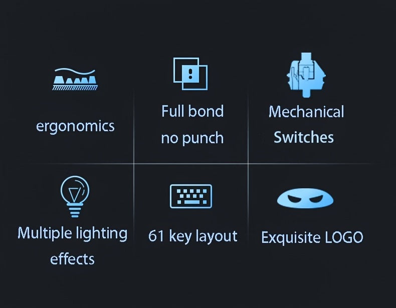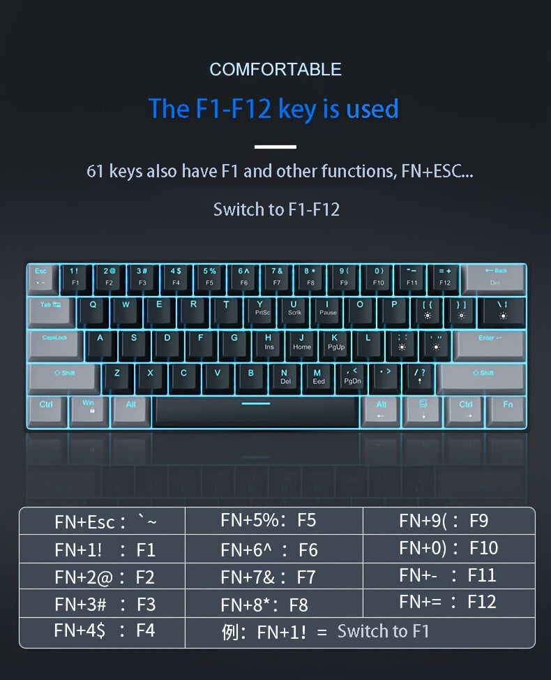 Tastatura mecanică de gaming MageGee cu 61 de taste are iluminare solidă albastru marin si oferă 19 moduri diferite de iluminare (Fn2 + | pentru comutarea luminii); iluminarea poate fi dezactivata dacă nu este necesară. Keycap-urile sunt realizate prin injecție dubla (double-shot), garantand o iluminare uniforma, stilata si fara reflexii.